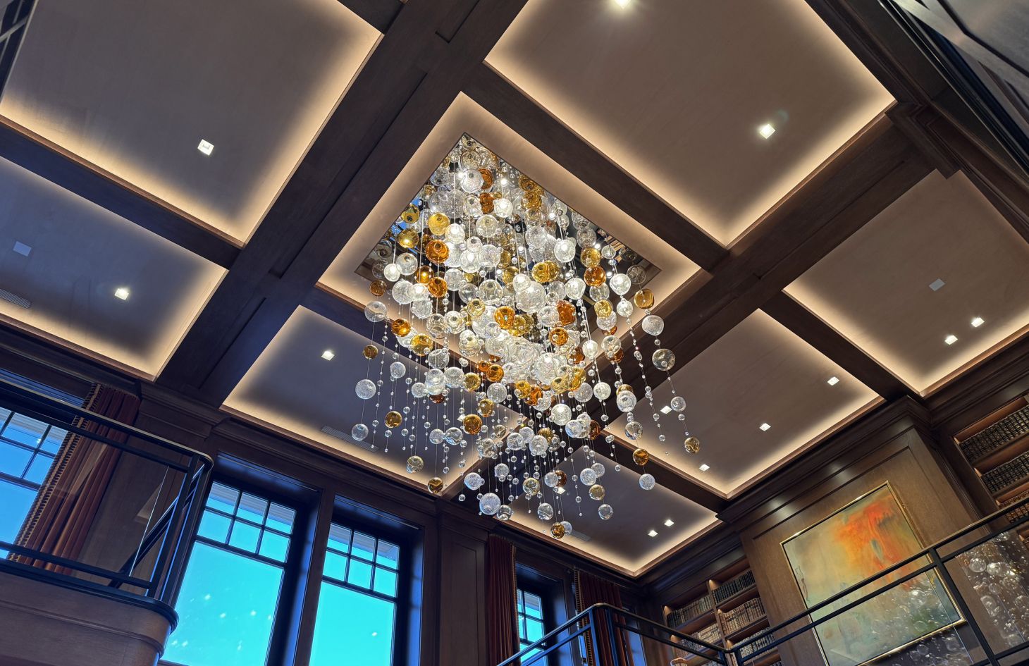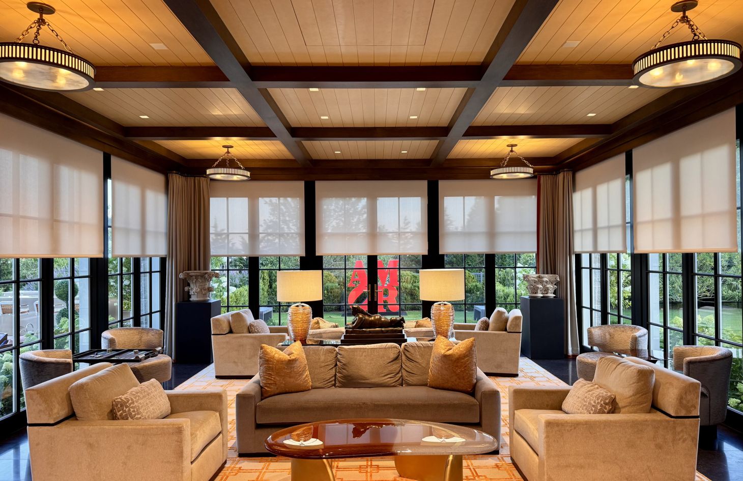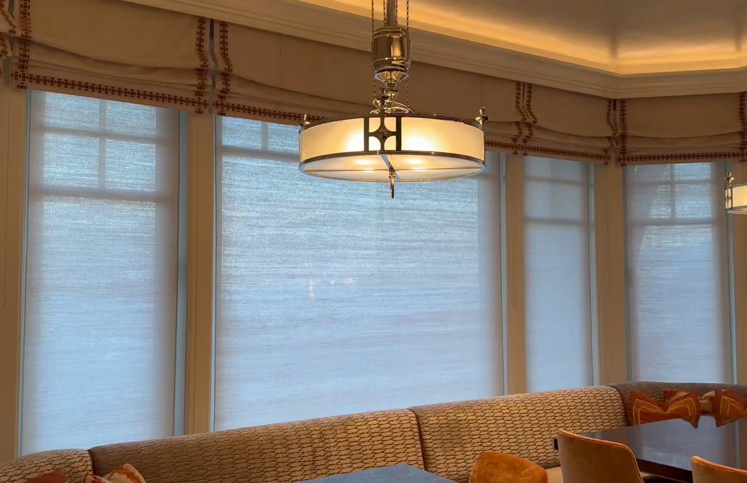 - 86 motorized Lutron shades and drapes