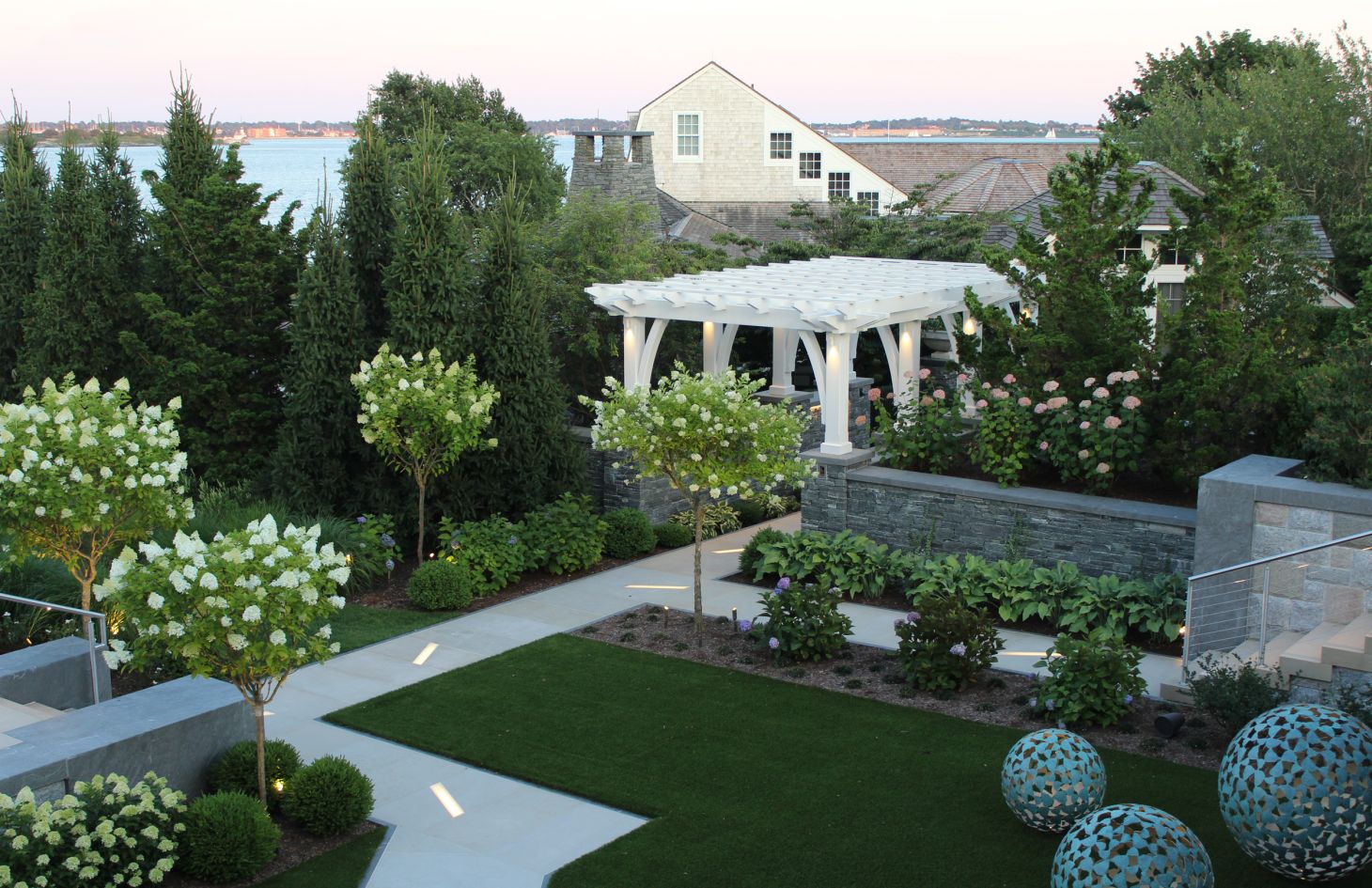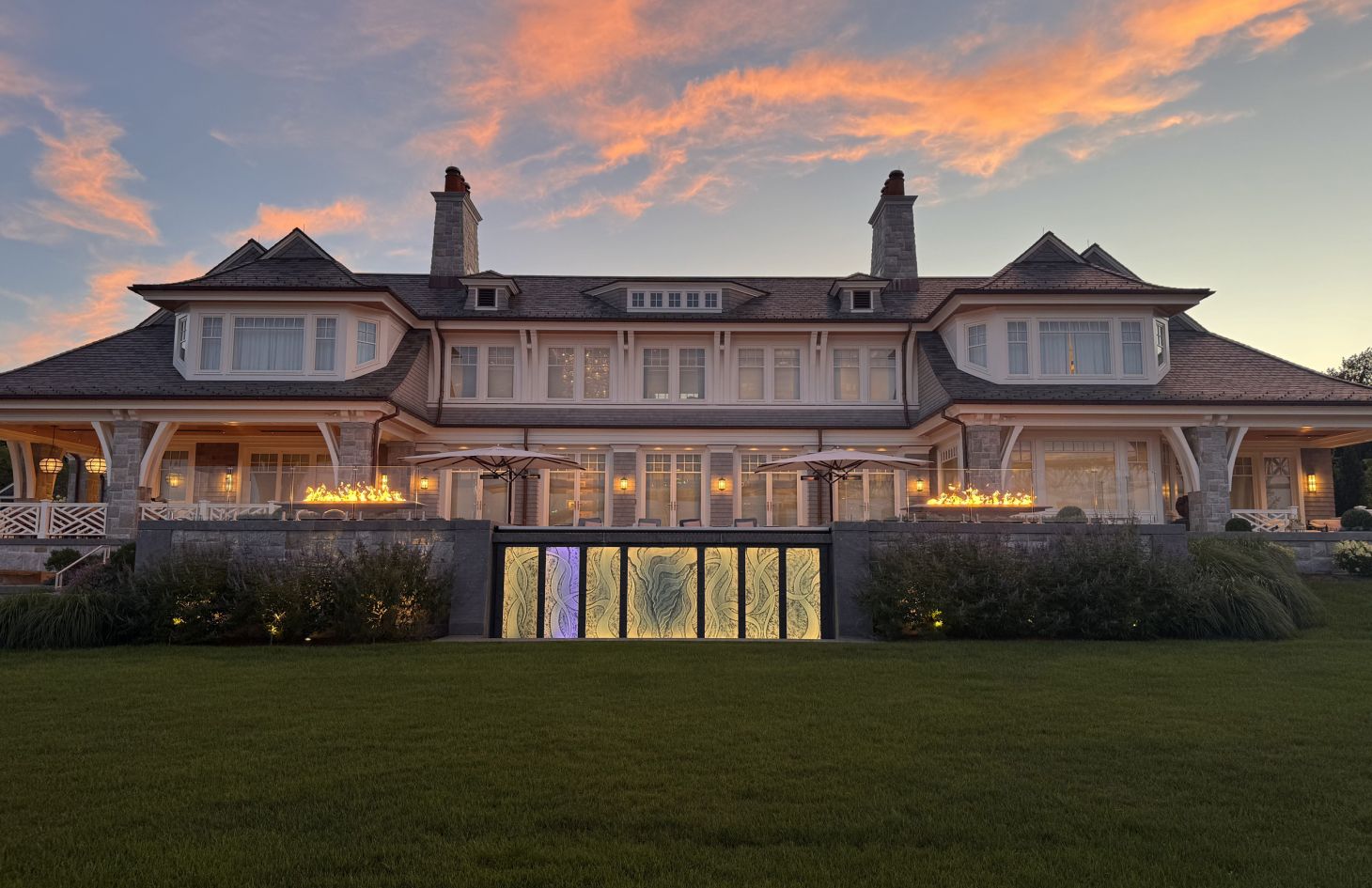 The estate spans several acres of oceanfront property. The southern portion of the property had the original home, built in 1992, and just up the hill was a cottage-style guest house added in 2018. These two spaces are linked by a backyard oasis fit with a tennis court, bocce court, pool, hot tub, cabana, pergola, and gathering areas that overlook the Atlantic Ocean.
